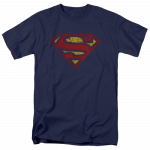 This is an officially licensed Superman Classic Logo Crackled Design Mens T-Shirt. This DC Comics blue/grey t-shirt is 100% cotton in Medium. This comfy shirt features the classic Superman S insignia, but instead of new, it looks old and weathered. So you can get cozy but look like youve been in the desert for about a month.