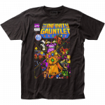 This is an officially licensed Infinity Gauntlet #1 Comic Cover Mens T-Shirt. This Marvel black t-shirt is 100% cotton in 2XLarge. It features the cover image to the very first issue, rendered by comic book legend George Perez.